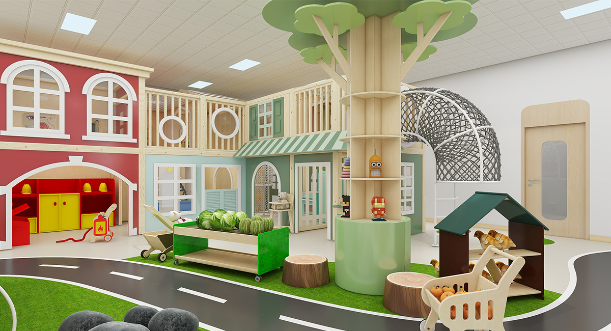 The Mini Town Interactive Street—also known as the Role Play Village—includes a mini café, fruit & vegetable market, kitchen station, and cashier area.