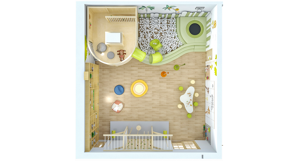 The playroom indoor playground of this daycare center adheres to creating a safe, comfortable, natural, happy, and diverse play space for children so that they can not only learn in the daycare center and adapt to social life but also retain their natural innocence, and release their vitality and passion.This customized indoor playroom also uses tones consistent with the design theme, such as log color, green, warm yellow, etc. At the same time, some bright colors are added to embellish the entire preschool indoor playground design, making the customized indoor playground look more vibrant and in line with children’s aesthetics.