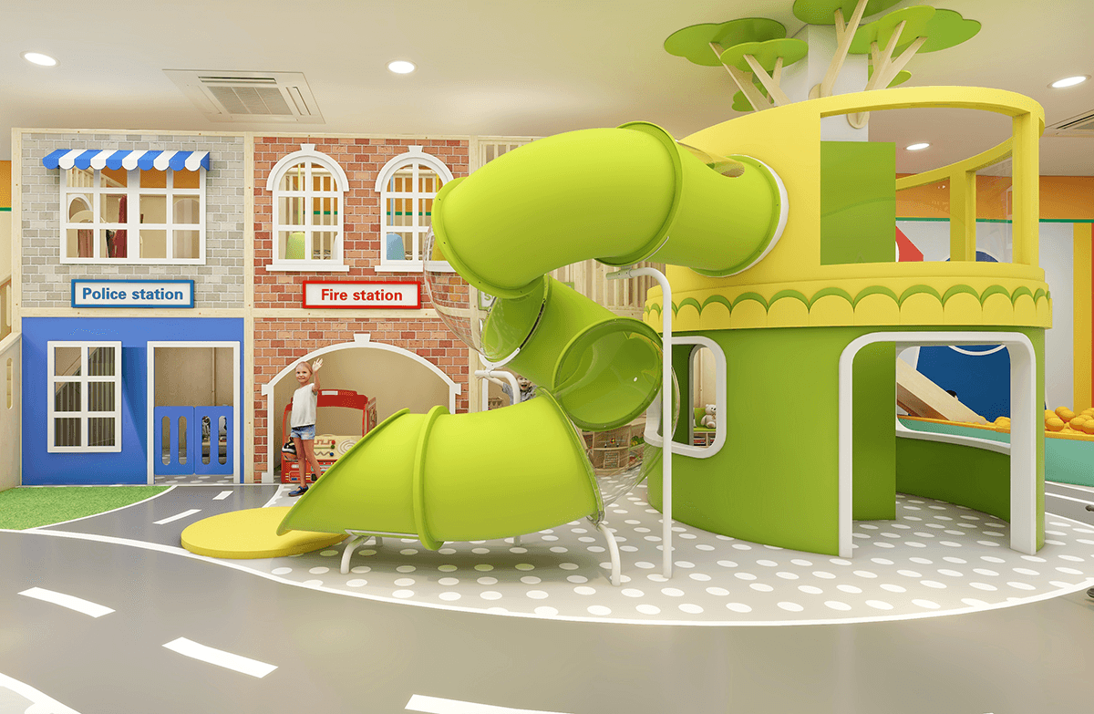 This Educational Indoor Play Space Kids Play Cafe is located in Connecticut, a city in the northeastern United States, and is designed for children aged 0-5. This kids play cafe covers an area of 150m², the overall layout is rectangular, and the usable height is 4.2 meters. Client aimed to create an Educational Indoor Play Space Children’s Enrichment Center that combines a comfortable cafe area with indoor amusement equipment for children playing. Here, parents can relax while children participate in imaginative games, exploration and adventure. A role playing mini town with realistic and interactive elements is created for children to stimulate their creativity and social interaction skills.