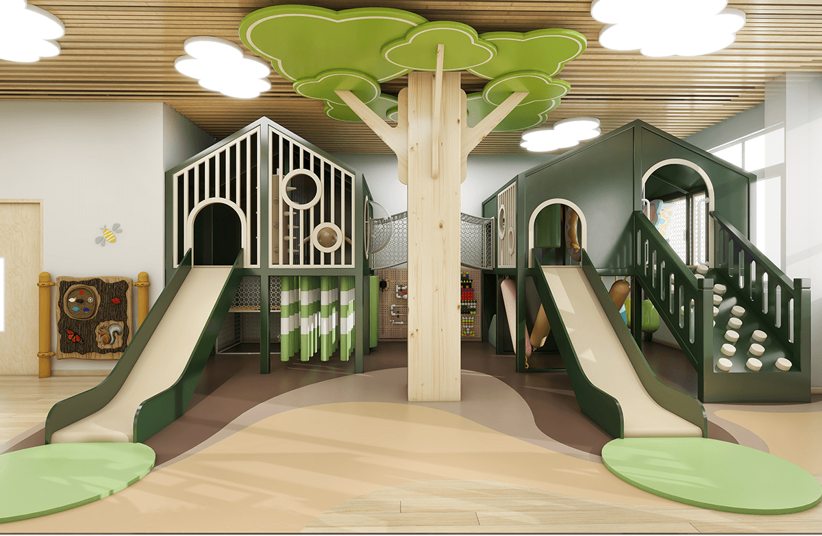 This kids play cafe design theme is “Forest Adventure” , combines natural elements with modern playground equipment, crafting a magical forest playground. The indoor playground design prioritizes safety, fun, and interactivity, encouraging children to explore nature, ignite their imagination, develop physical abilities, and build social skills.
