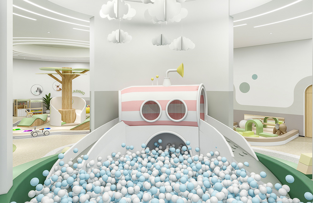 Active Play Zone: Features a soft sensory play area integrated with a preschool play structure, a wooden play house, a ball pit, and other preschool indoor playground equipment.