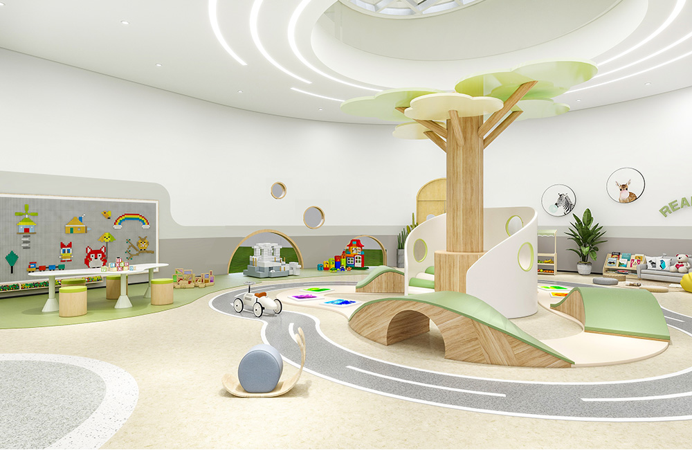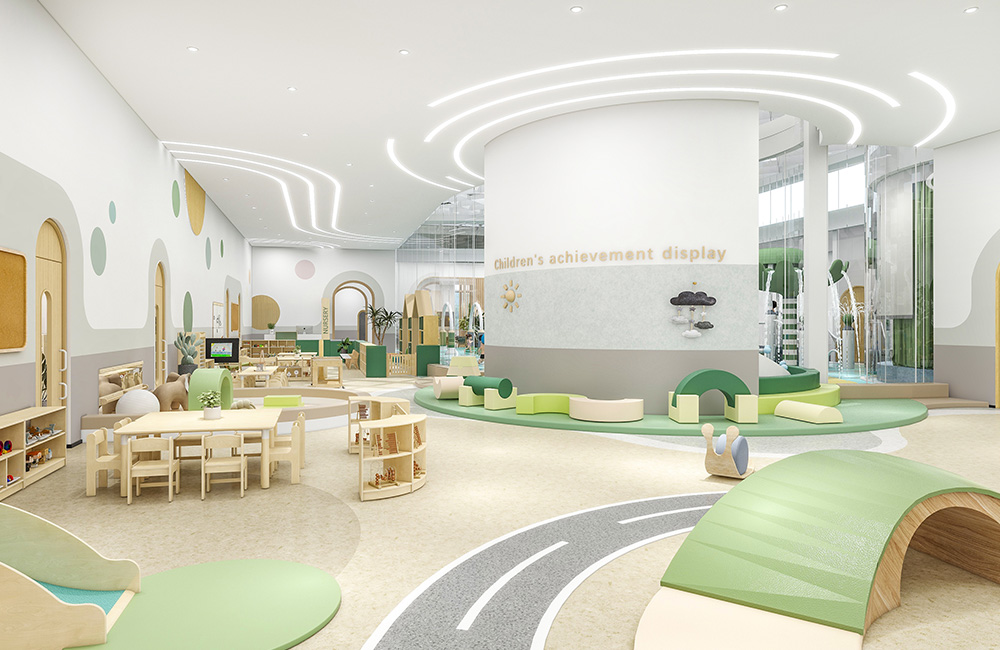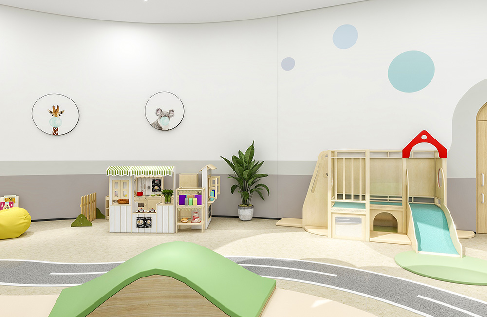 The core objective was to develop a widely open nursery area that facilitates simultaneous activities without fixed walls—a fundamental principle in modern childcare interior design, with the preschool play structure serving as the focal point.