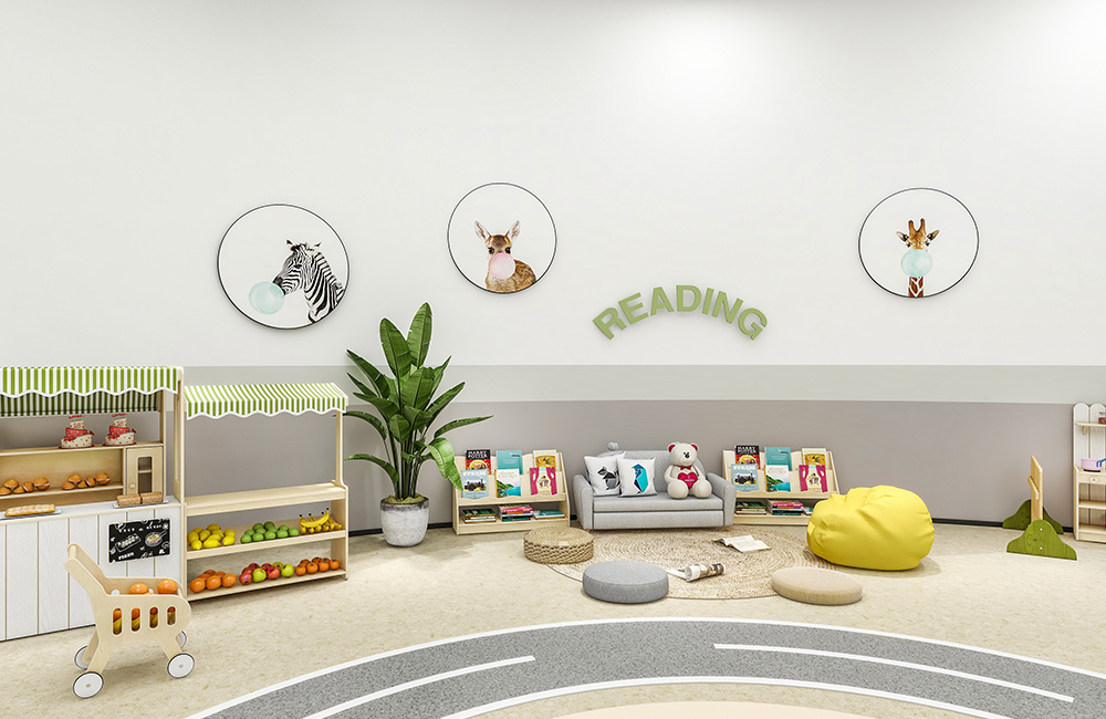 Creative & Quiet Zones: Includes dedicated spaces for reading, art, role-play, and block games, complemented by display boards for children’s artwork.
