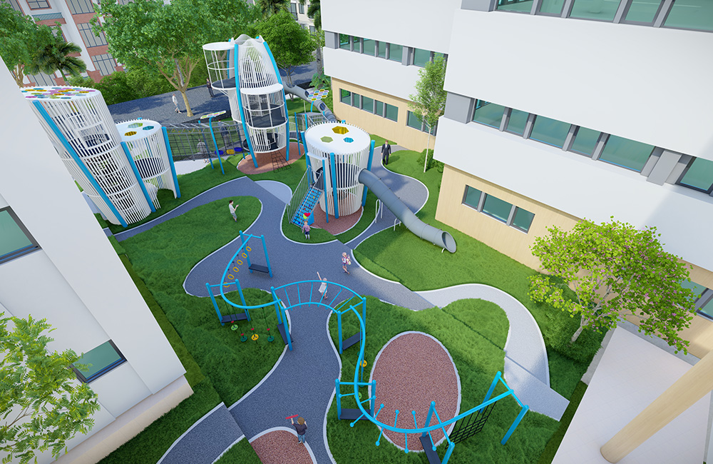 The playground’s color palette incorporates the school’s signature blue tones, maintaining visual consistency with its modern architectural style.