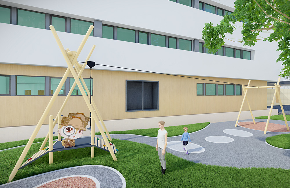 The zipline brings excitement and adrenaline into the playground experience. It helps children develop balance, courage, and spatial awareness, and has become a signature feature often emphasized in conceptual school playground designs for its interactive and cooperative qualities.