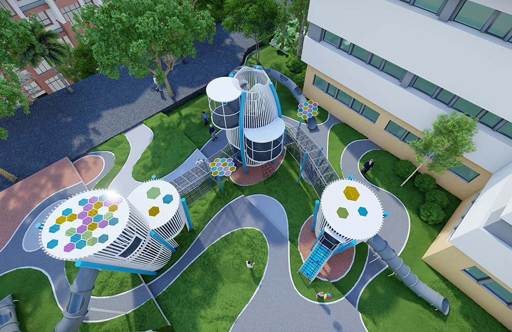 The roof of the play towers is crowned with colorful hexagon acrylic windows, creating a kaleidoscope of filtered sunlight — a visual highlight that merges art, architecture, and play.