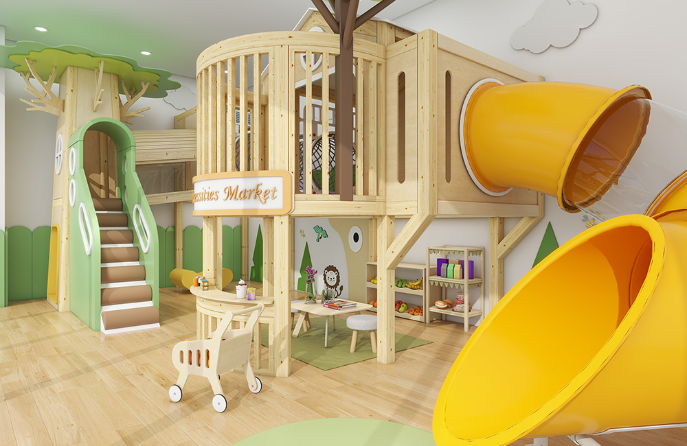 This indoor play space features wooden treehouses, slides, and multi-level stairs, providing a layered spatial experience that not only encourages physical activity but also helps develop spatial awareness and coordination.