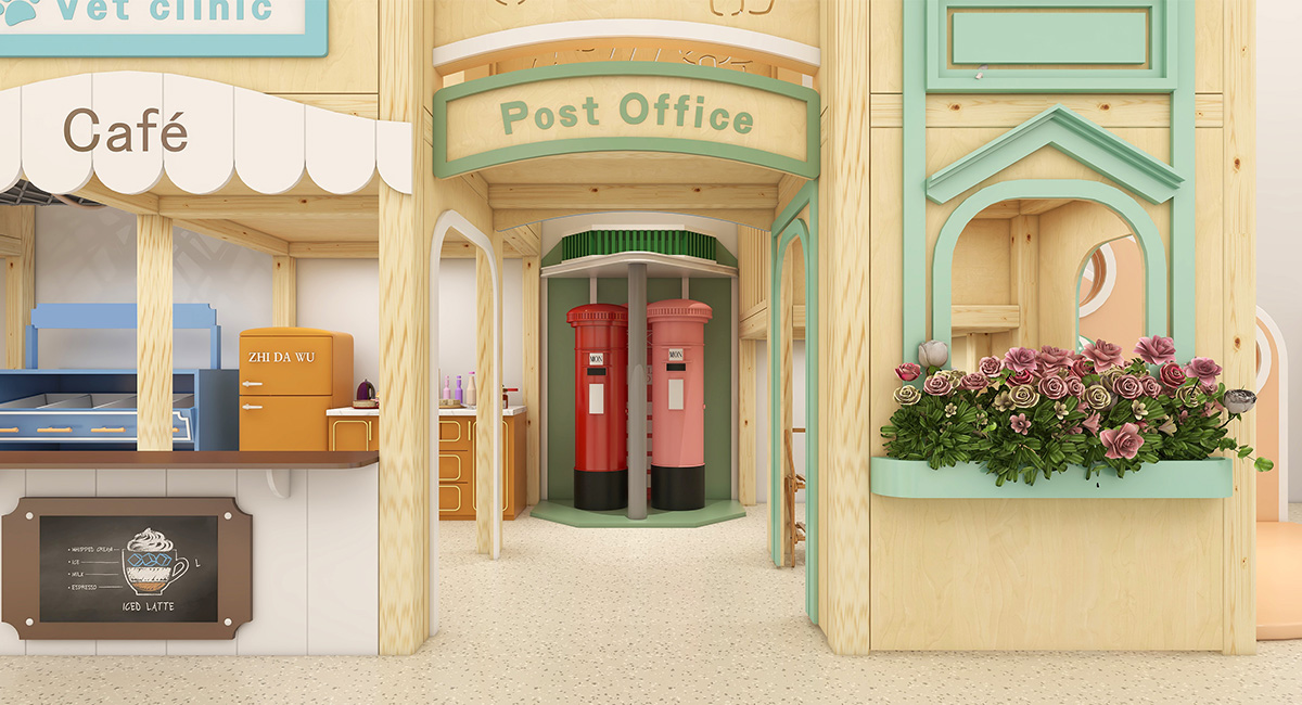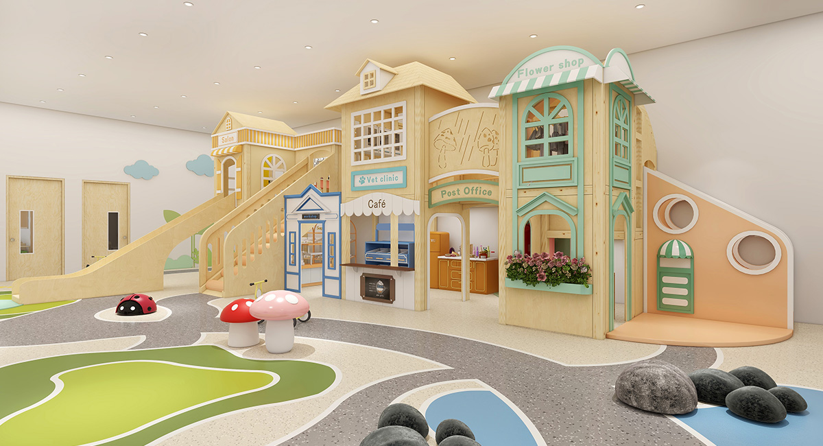 This Role Play Village blends a natural theme indoor playground design with a miniature urban town concept, creating an immersive play environment where children learn, explore, and interact through role play.