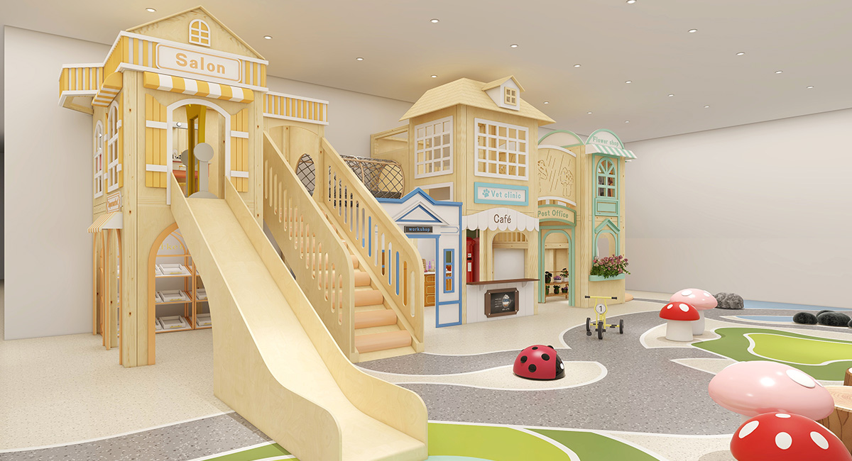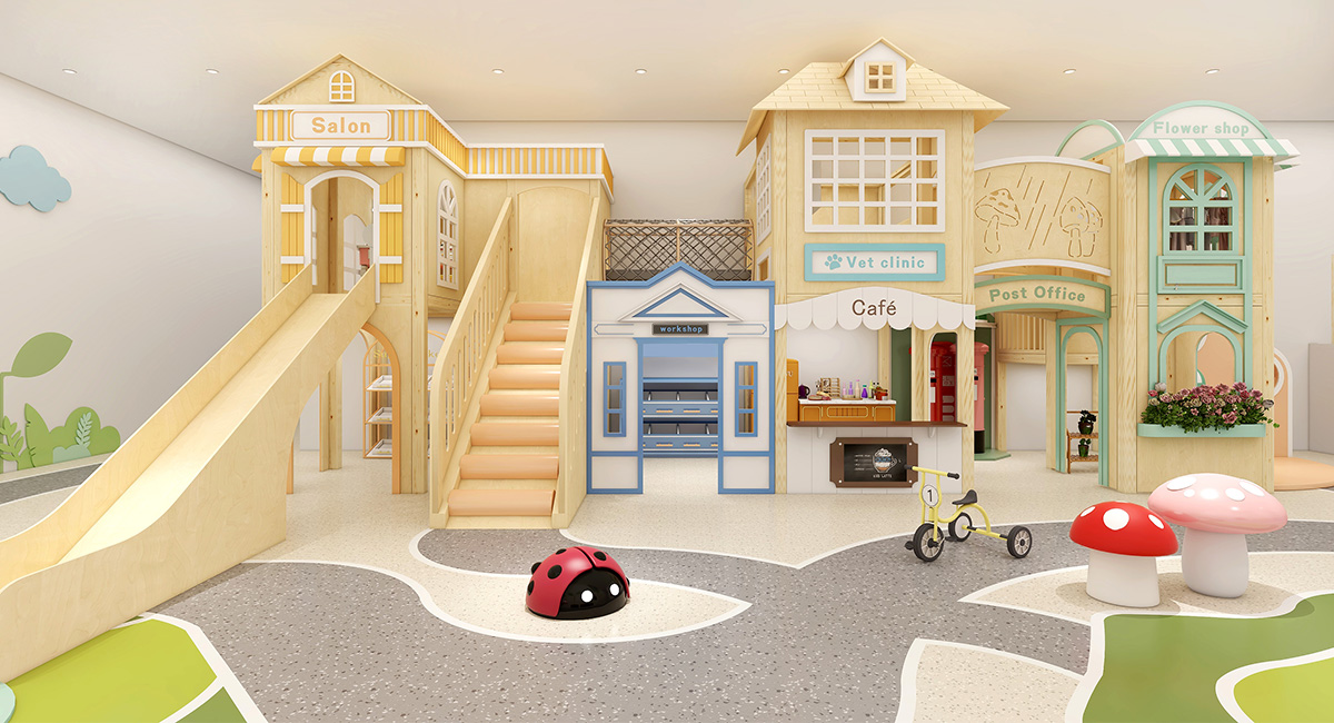 Designed for operators opening a Play Café, starting a Play Café business, or planning to open a kids play zone, this solution upgrades traditional indoor playgrounds into a story-driven indoor role play town that supports both early childhood learning and sustainable business operation.
